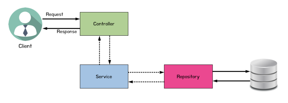- Controller: 클라이언트의 요청을 받음, 요청에 대한 로직 처리는 Service에게 전담, Service에서 처리 완료된 결과를 클라이언트에게 응답