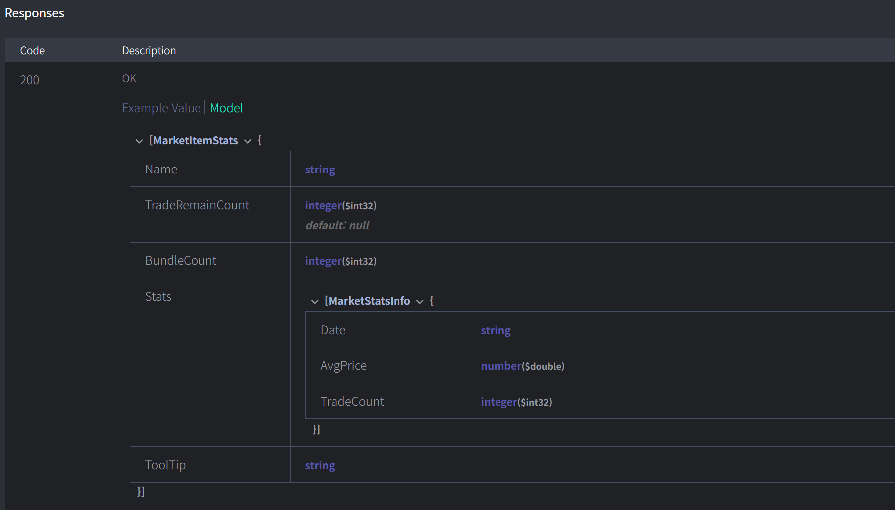 LostArk Developer의 시세 조회 swagger를 보면 다음과 같이 Response를 출력한다.