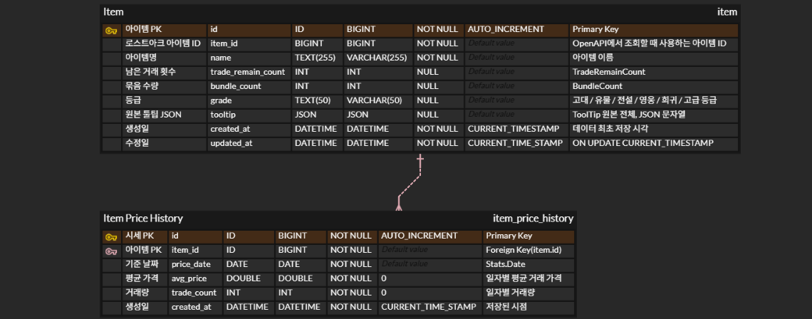- @ManyToOne(fetch = FetchType.LAZY): 가격 히스토리를 조회할 때 굳이 item 전체를 끌어오지 않도록 최적화, 아이템 상세가 필요할 때만 join됨
