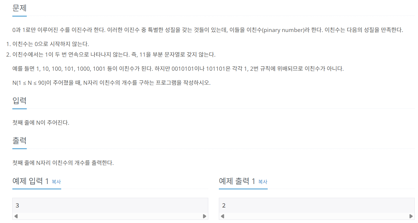 배열 D[i][0]은 i길이에서 끝이 0으로 끝나는 이친수의 개수, D[i][1]은 i길이에서 끝이 1로 끝나는 이친수의 개수이다. 이때, 1은 연속해서 올 수 없으므로 D[i + 1][0]은 D[i][0]과 D[i][1]의 합과 같고, D[i + 1][1]은 D[i][0]의 값과 같다.