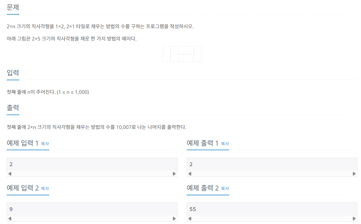 i번째 타일을 채우는 경우의 수는 i - 1번째 타일에서 1 X 2 타일을 넣으면 되고, 1 - 2번째 타일에서 2 x 1 타일 2개를 넣으면 되기 때문에, D[i] = D[i - 1] + D[i - 2]와 같다.
