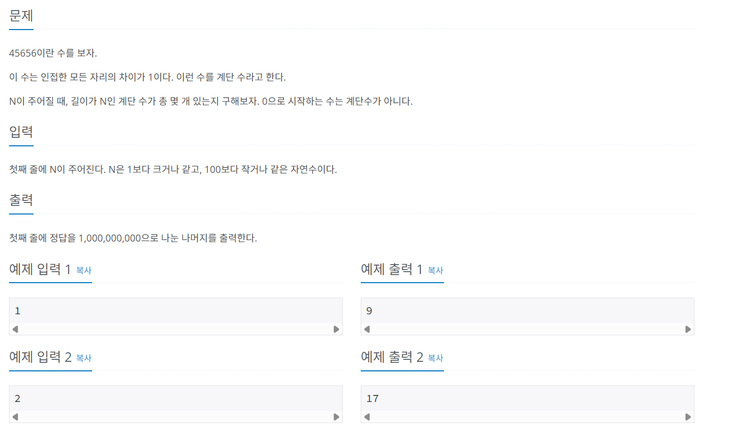 배열 D[N][H] 를 길이가 N인 숫자에서 끝이 H인 숫자의 경우의 수를 의미한다. 그래서 H = 0 이면 D[i][H] = D[i - 1][1] 과 같고, H = 9이면 D[i][H] = D[i - 1][8] 과 같다. 나머지 경우에서는 D[i][H] = D[i - 1][H - 1] + D[i - 1][H + 1] 과 같으므로 위와 같은 반복문을 통해 구현했다.