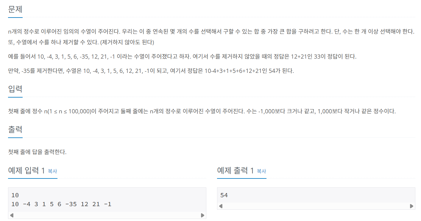 배열 A에 입력된 값들을 저장하고, 배열 L은 왼쪽부터 더해서 최대값일 때를 저장하고, R은 오른쪽 부터 더해서 최대값일 때를 저장한다. 그리고 마지막으로 i 번째 원소를 제외했을 때 합을 구해서 그것과 전의 최대값을 비교해 제외했을 때와 제외하지 않았을 때의 최대값을 비교해 결과를 출력한다.