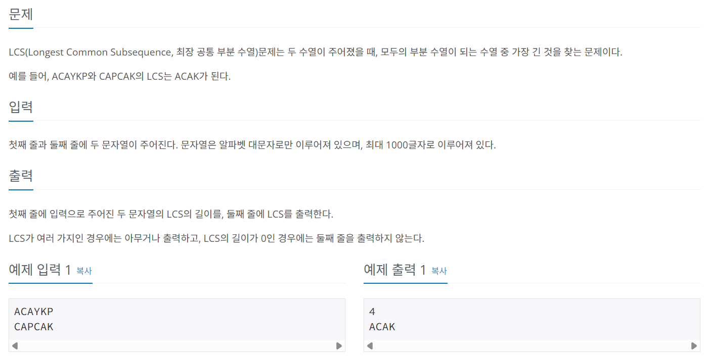 먼저 DP에 필요한 배열을 2차원 배열로 만든 다음에 입력된 두 문자열의 각 자리수가 같으면 최장 공통 부분에 들어가므로 D[i][j] = D[i - 1][j - 1] + 1 (대각선 방향)을 해준다. 같지 않으면 D[i - 1][j]와 D[i][j - 1] 중에 큰 값을 가져온다. 그러면 D[A.length() + 1][B.length() + 1]에는 최장 공통 부분의 길이가 들어가게 된다.