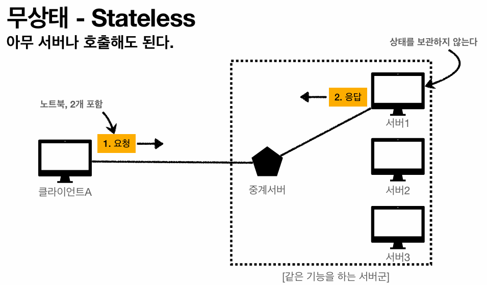- 무상태는 응답 서버를 쉽게 바꿀 수 있어 무한한 서버 증설이 가능
