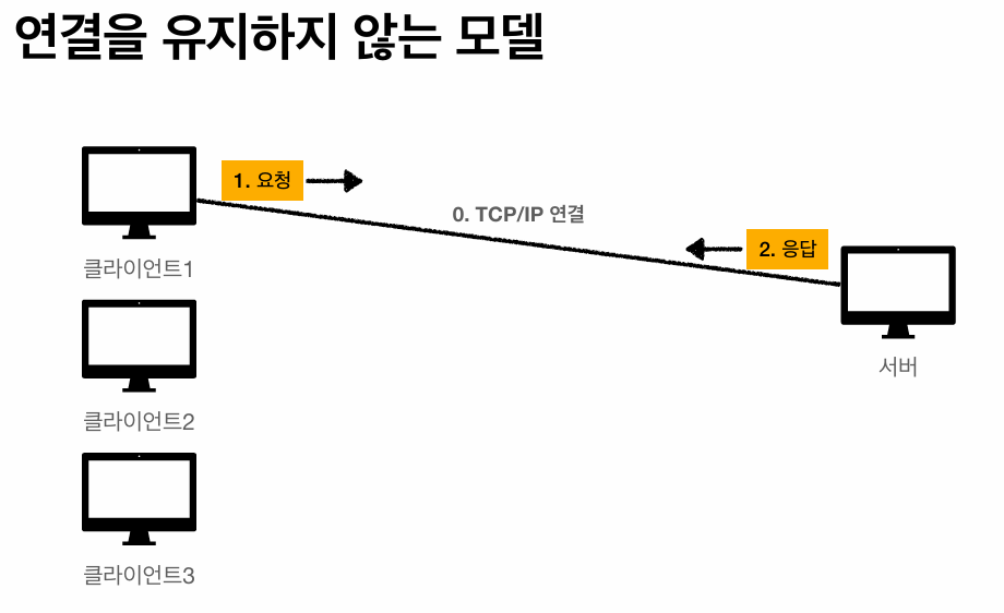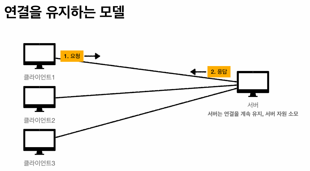 - 연결을 유지하는 모델에서는 서버 자원을 계속 소모해야 한다.