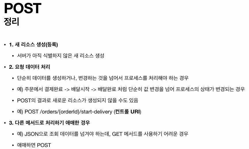 POST 메서드는 대상 리소스가 리소스의 고유 한 의미 체계에 따라 요청에 포함 된 표현을 처리하도록 요청한다. 이 리소스 URI에 POST 요청이 오면 요청 데이터를 어떻게 처리할지 리소스마다 따로 정해야 한다.