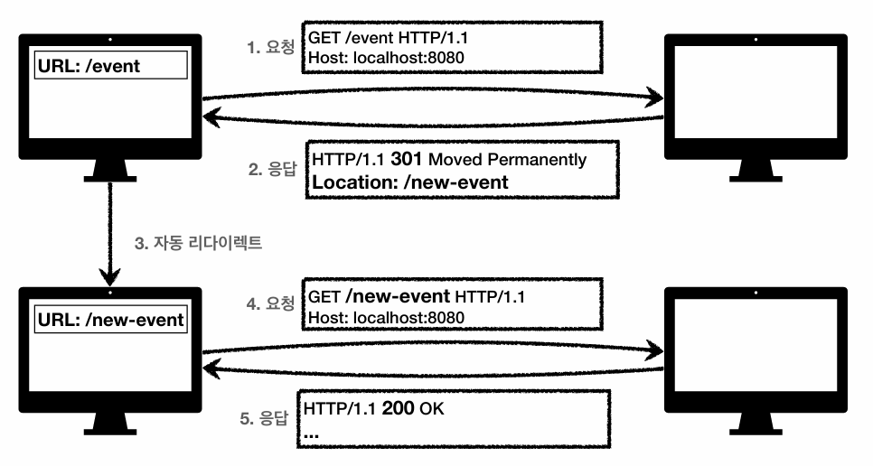 웹 브라우저는 3xx 응답의 결과에 Location 헤더가 있으면, Location 위치로 자동 이동한다(리다이렉트). 자동 리다이렉트의 흐름은 다음과 같다.