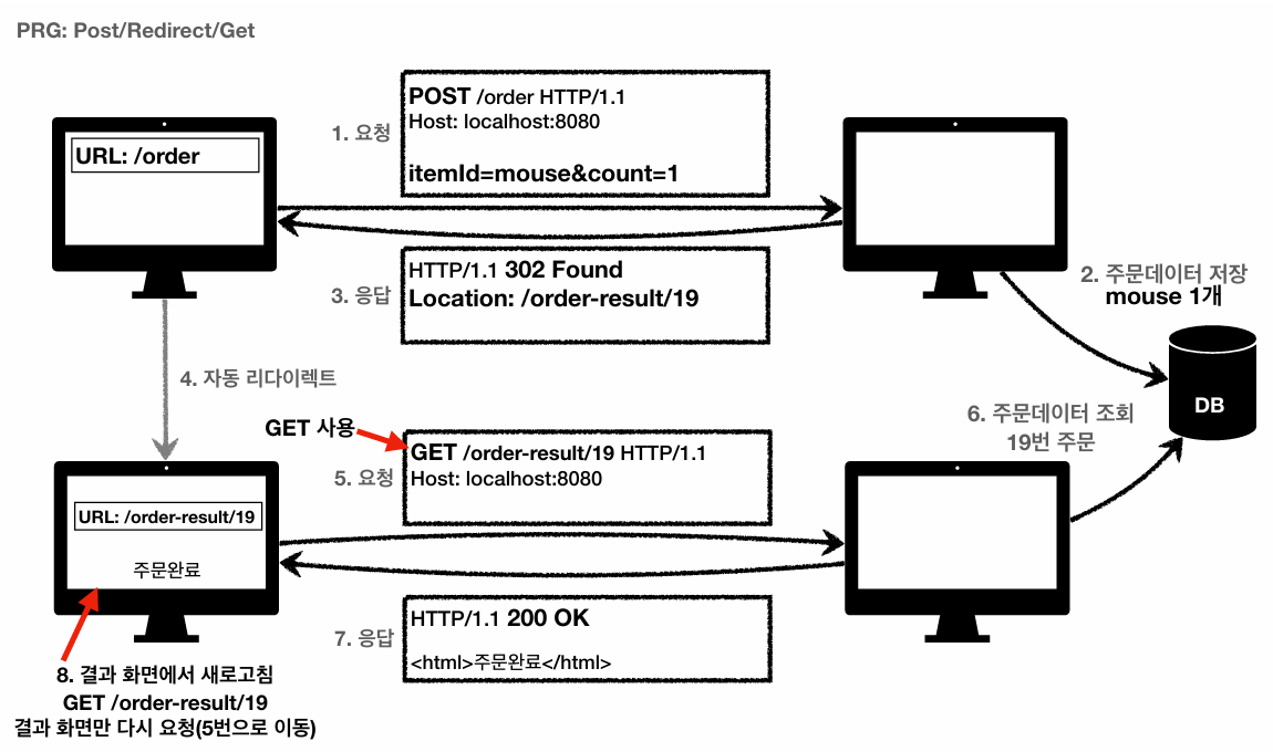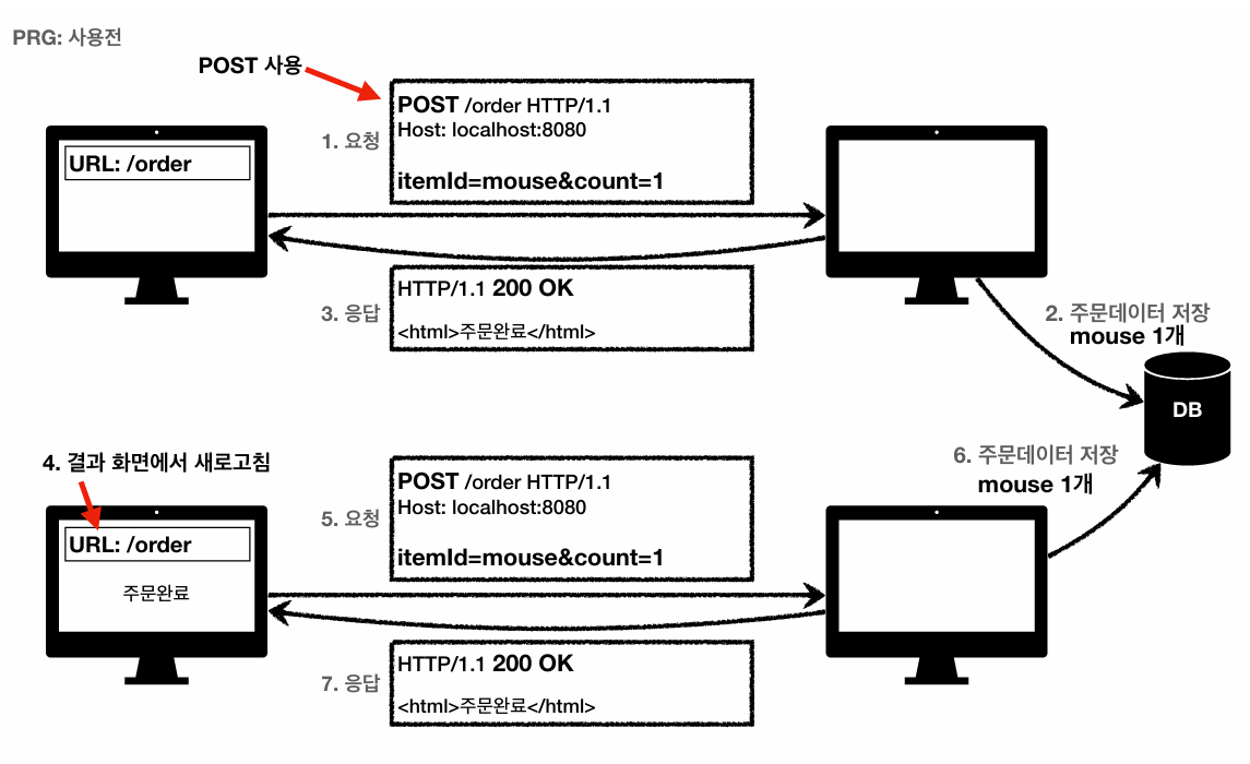 다음은 PRG(Post/Redirect/Get)라닌 일시적인 리다이렉션 예시이다. 이는 POST로 주문후에 웹 브라우저를 새로고침하면 새로고침은 다시 요청해, 중복 주분이 될 수 있다는 의미이다.
