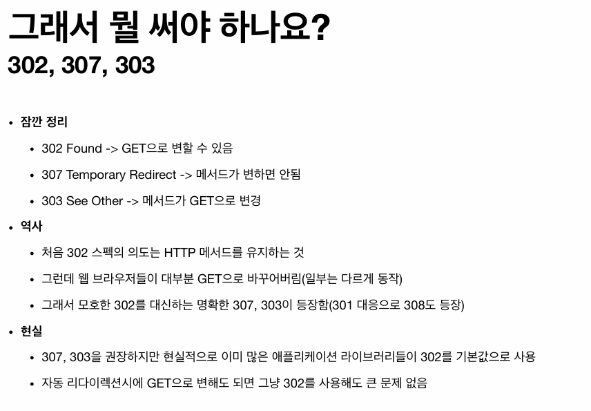 - 리다이렉션시 요청 메서드와 본문 유지(요청 메서드를 변경하면 안된다. MUST NOT)