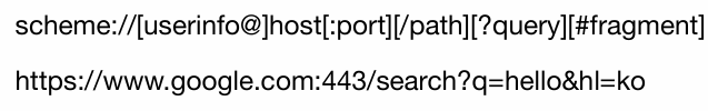 URL은 프로토콜(https) :// 호스트명(www.google.com) : 포트번호(443) 패스(/search) ? 쿼리 파라미터(q=hello&hl=ko)로 분류된다.
